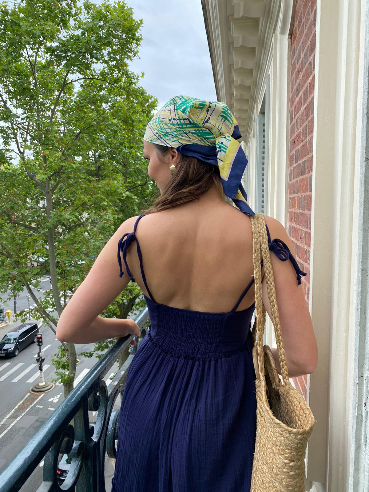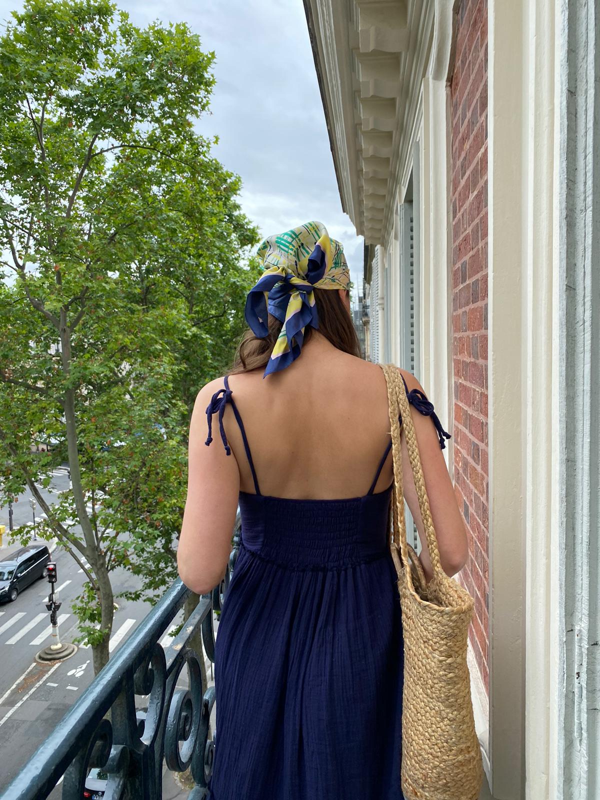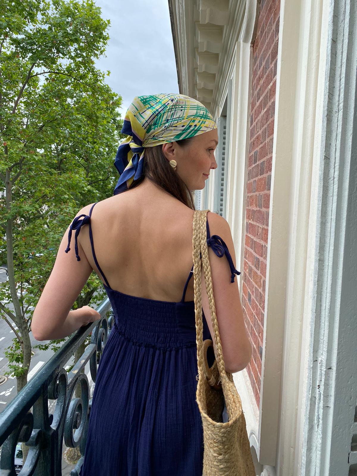 Cette robe avec ses nœuds sur les épaules qui lui donne un côté féminin et pratique, est la petite robe pure, légère, agréable à porter pour ces beaux jours.